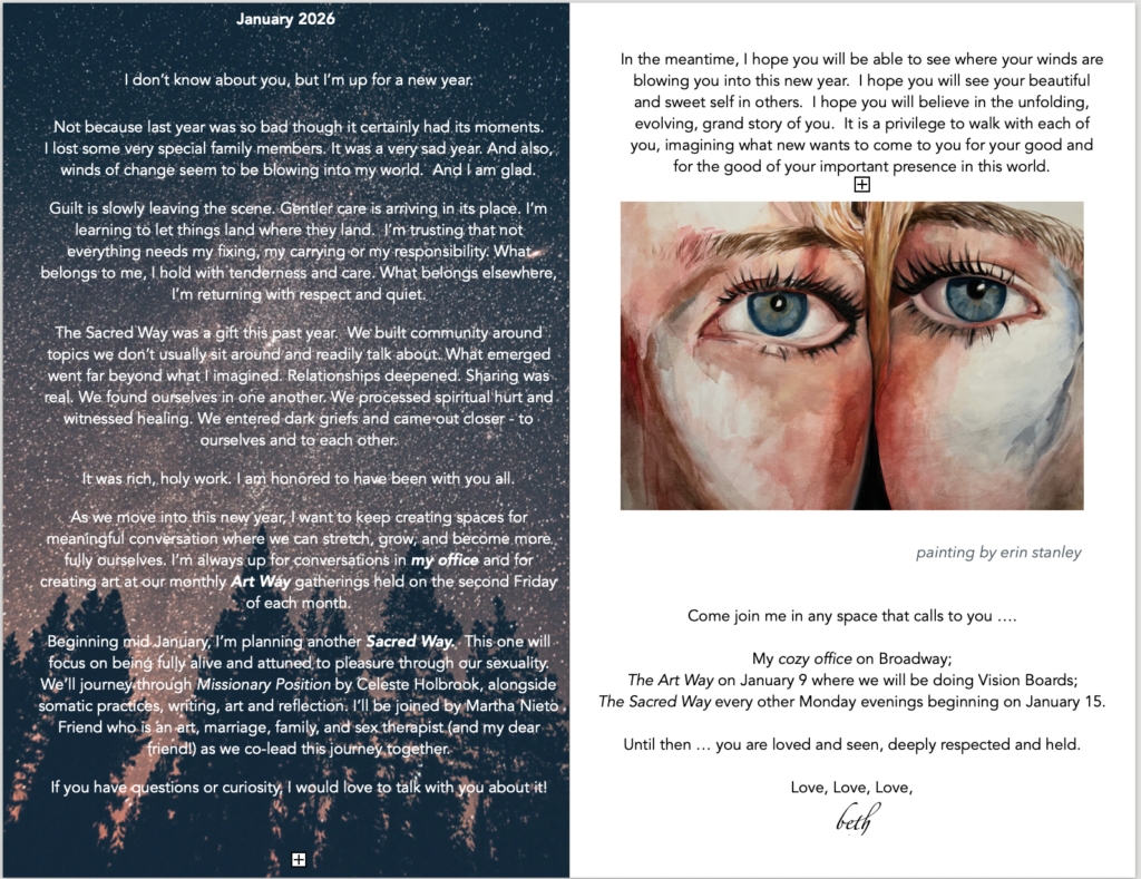 Beginning in mid-January, I’m also planning another Sacred Way. This one will focus on being fully alive and fully in touch with pleasure through our sexuality. We’ll journey through Missionary Position by Celeste Holbrook, alongside somatic practices, writing, art, and reflection. I’ll be joined by Martha Nieto Friend, art, marriage, family, and sex therapist (and my dear friend!) as we co-lead this work together. If you have questions or curiosity, I would love to talk with you about it.